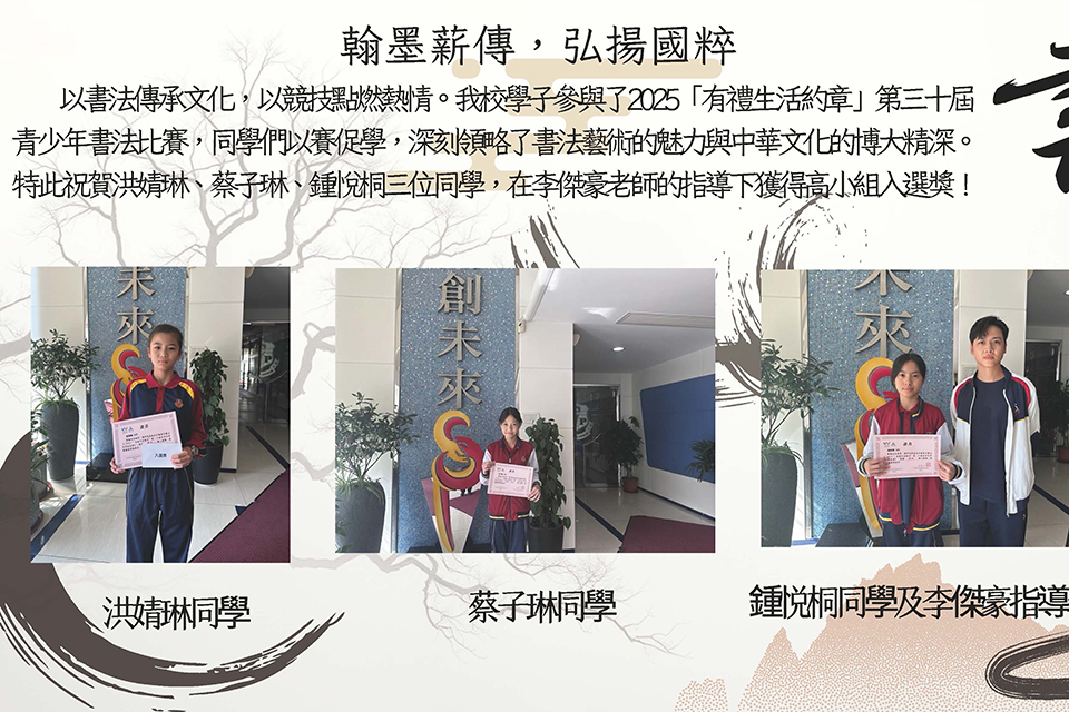 高小學生参與由澳門中華學生联合總會主辦之「第四十三屆全澳學生毛筆書法比赛」,學生透過此活動,加深了對中國書法的認識和對中華民族文化的熱爱,同时祝賀P6F鍾悅桐獲得小學臨帖組入選獎。