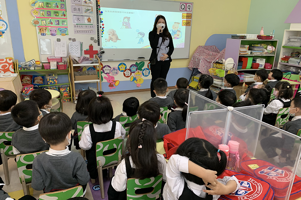 學生輔導員為K1學生進行情緒工作坊,目的是為了讓學生懂得分辨在生活中的情緒變化﹝喜、怒、哀、樂﹞,並協助和教導正確的方式以表達自身的情緒,降低他們以肢體表達和發洩的機會。